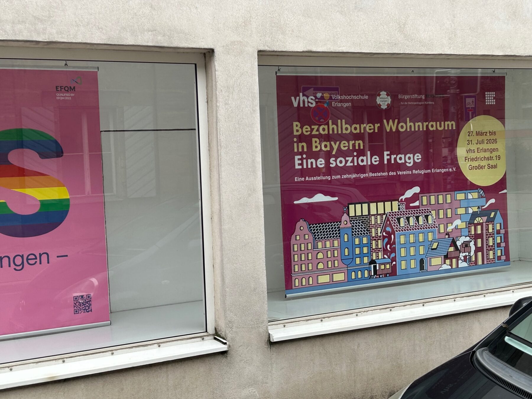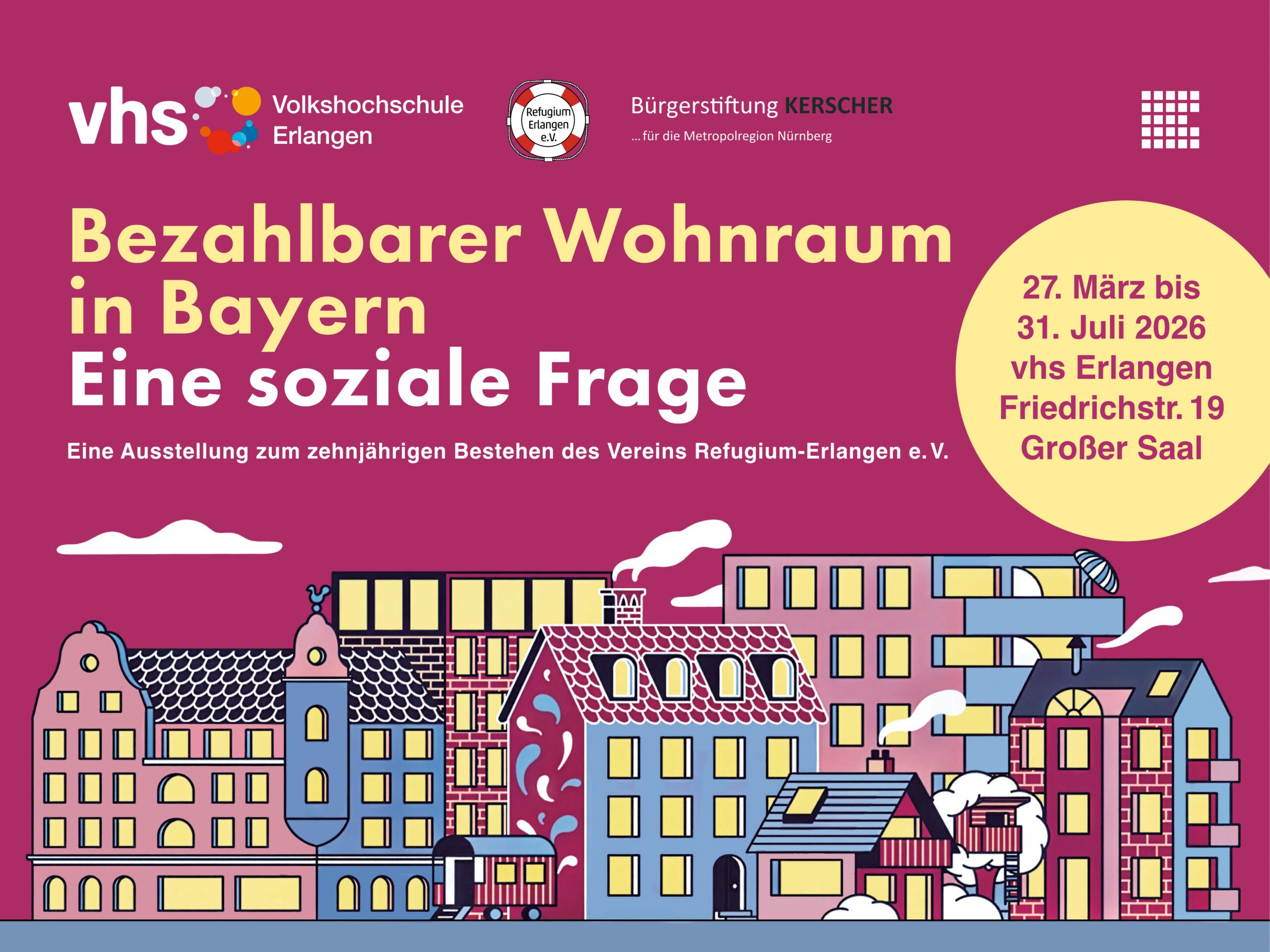 | 13. April bis 31. Juli 2026 Montag bis Freitag, 10:00 bis 17:00 Uhr mit Ausnahme von Feiertagen und den Ferien | Bezahlbarer Wohnraum in Bayern Eine soziale Frage Eine Ausstellung anlässlich des 10-jährigen Jubiläums des Vereins Refugium-Erlangen e. V. |
