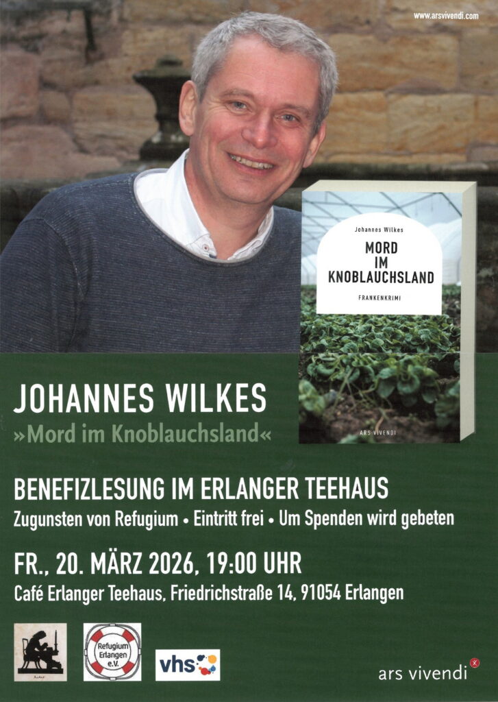 Kulinarische Benefizlesung zugunsten von »Refugium«: Autor Johannes Wilkes liest aus dem neuesten Fall von Kommissar Mütze & Karl-Dieter: Ein toter CEO in einer Pfütze im Knoblauchsland, dort wo die Flugzeuge des Nürnberger Flughafens im Minutentakt über die Felder donnern. Zuständig für den Mord im Knoblauchsland, so der Titel des Buches, ist Hauptkommissar Mütze aus Erlangen. Zusammen mit seinem Lieblingskollegen Big Chip, dem genialen Forensiker Krautwurst und seinem Partner Karl-Dieter stürzt sich Mütze in die Ermittlungen: Ein schräger Frankenkrimi und eine wilde Geschichte voller Liebe, Leidenschaft und jeder Menge Blut!