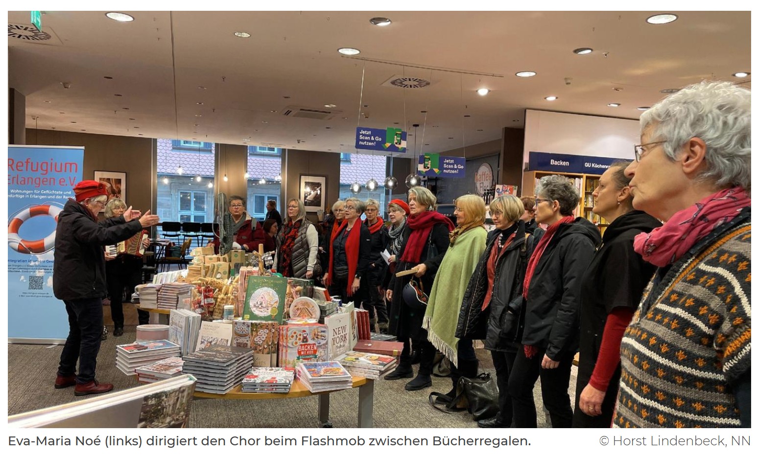 ![]() | Information zur Wohnungsnot und den Vereinszielen, Flashmob Dezibella – Der Erlanger Chor – bei Thalia Bücher Erlangen (Erlanger Nachrichten online 19.12.2022) Video: Flashmob mit dezibella |