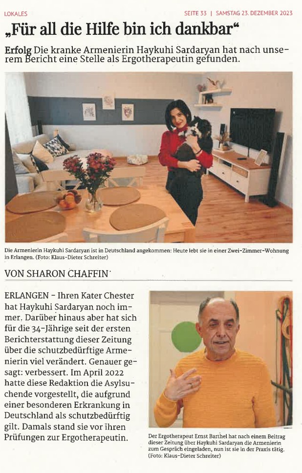 ![]() | „Für all die Hilfe bin ich dankbar“ Erfolg. Die Armenierin Hyakuhi Sardayan hat eine Stelle als Ergotherapeutin gefunden. (Erlanger Nachrichten Lokalteil 23.12.2023) |