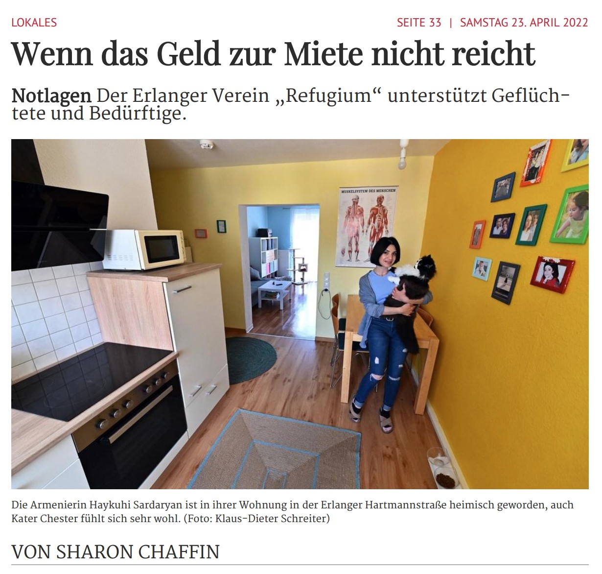 ![]() | Wenn das Geld zur Miete nicht reicht. Notlagen. Der Erlanger Verein Refugium unterstützt Geflüchtete und Bedürftige (Erlanger Nachrichten Lokalteil 23.04.2022) |