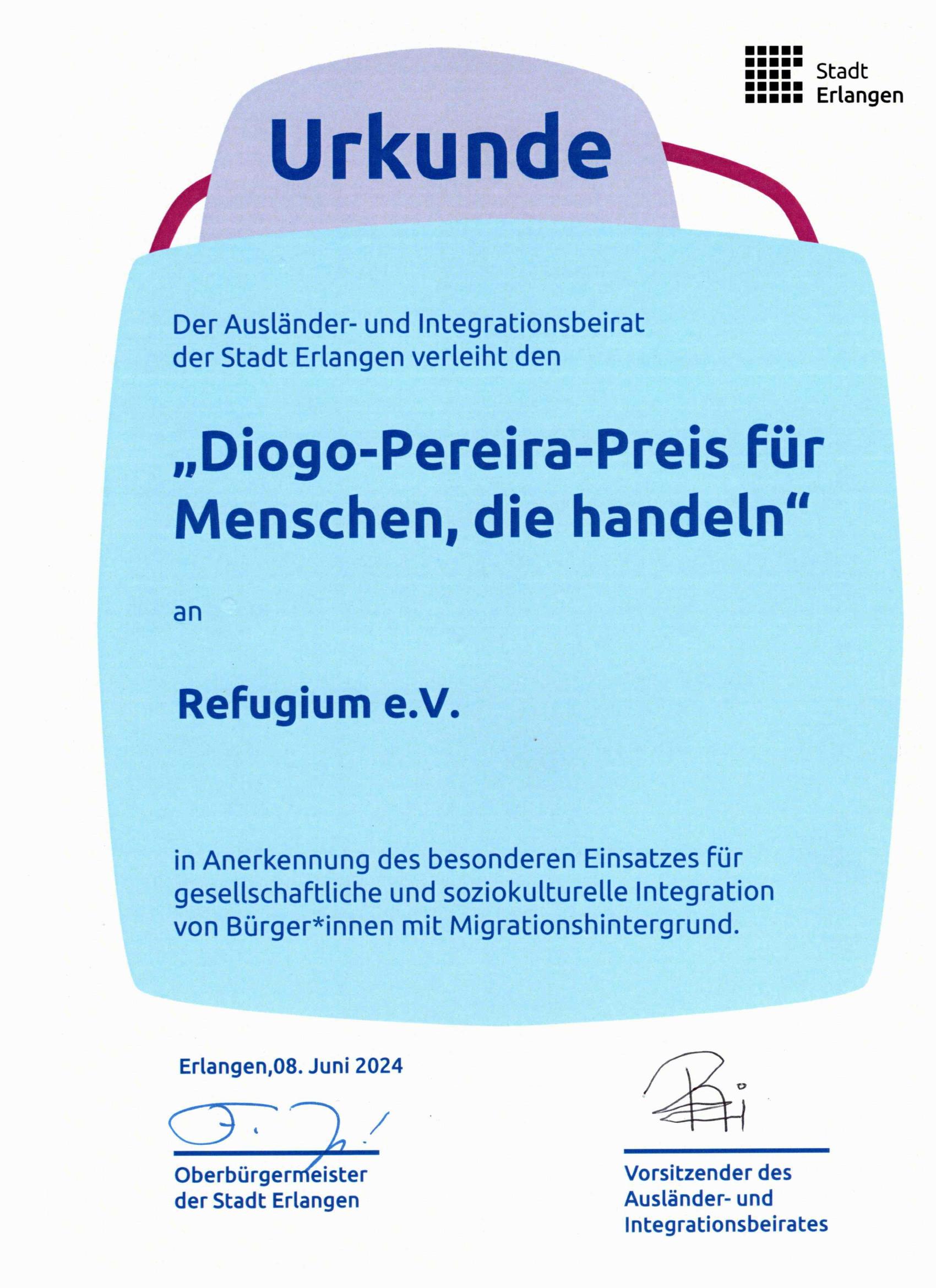 ![]() | „Diogo-Pereira-Preis“: Der Ausländer- und Integrationsbeirat der Stadt Erlangen schreibt den „Diogo-Pereira-Preis für Menschen, die handeln“ in Erlangen aus. Er wird seit 1997 verliehen. ,,, Außerdem erhielt der Refugium e.V. den mit 500 Euro dotierten Preis. Der Verein unterstützt seit 2016 Geflüchtete und sozial benachteiligte Menschen bei der Wohnungssuche. (Erlanger Nachrichten 14. Juni 2024) |