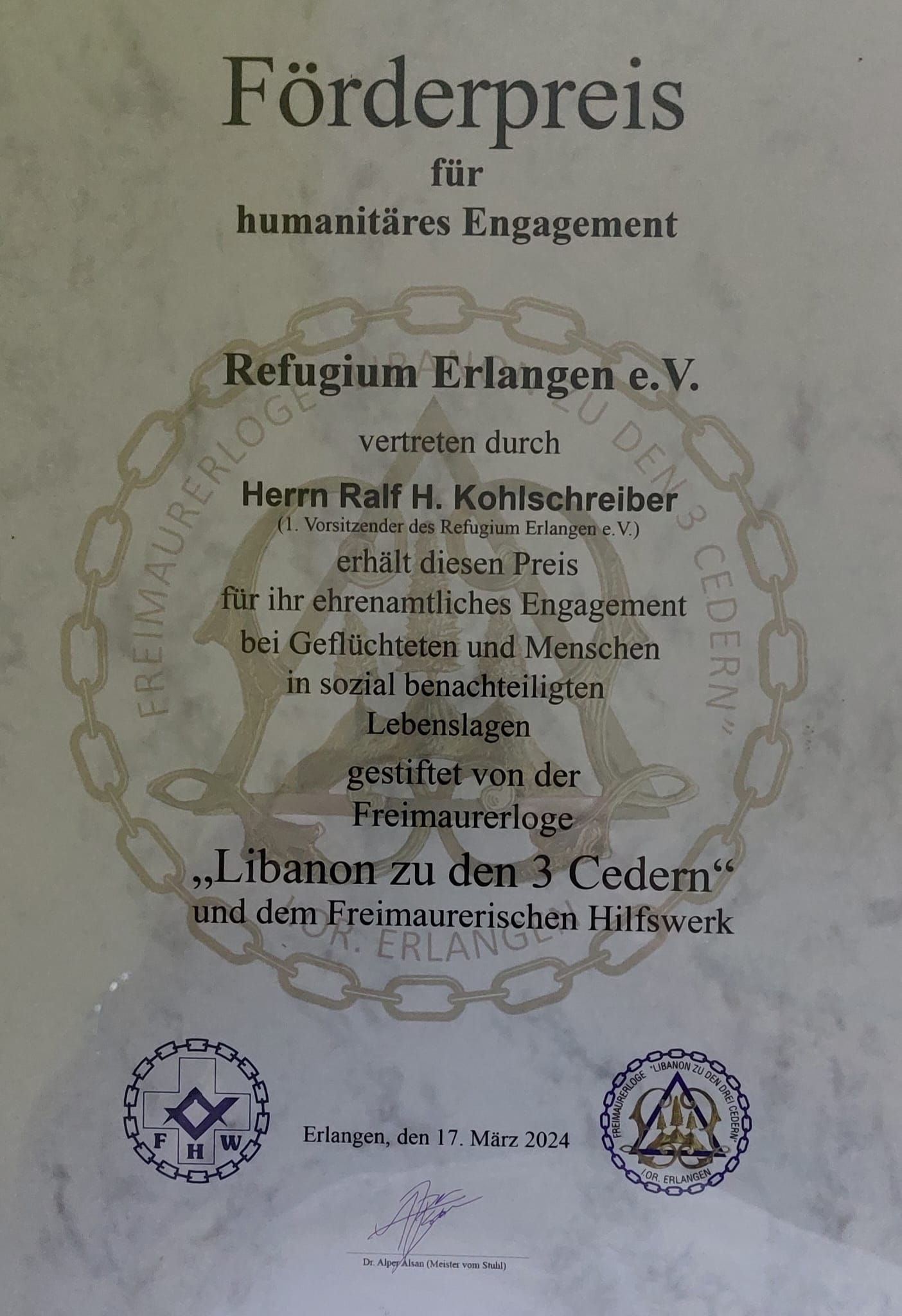![]() | „Preis für Humanitäres Engagement“ Hilfe. Freimaurerloge zeichnet Verein Refugium Erlangen aus. (Erlanger Nachrichten Lokalteil 06.04.2024) |