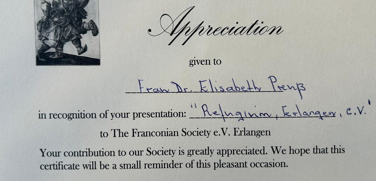 Auf Einladung der Franconian Society referierte die zweite Vorsitzende von Refugium Erlangen, Elske Preuß, anlässlich eines Charity-Dinners über die Arbeit von Refugium. Die Entstehung von […]